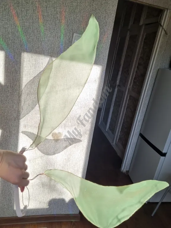 Крыло в длину 45см, положение регулируется, там медная проволока, она хорошо держит форму, но гнётся, от лака ткань хорошо блестит