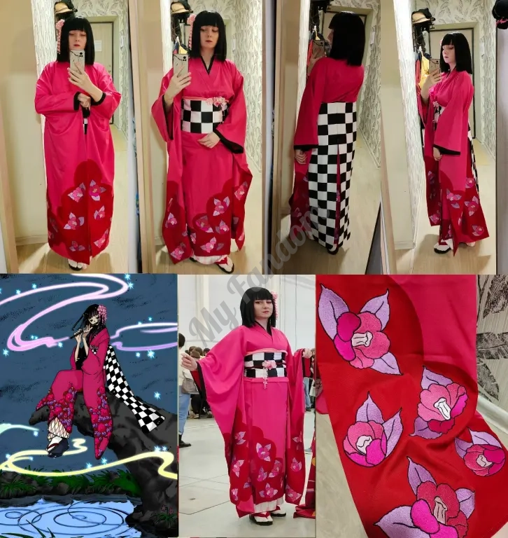 Зашики Вараши из XXXholic (Триплексоголик). Кимоно подойдёт и для красивого косплея в японском стиле. Размер от S до XL. В комплект входят: само кимоно (проф. пошив с печатью по ткани и вышитыми цветами, надевается как кимоно), два пояска для фиксирования кимоно, пояс оби (на шнуровке сзади + «хвосты» на кнопках), бордовый поясок на оби, украшения на оби, юбка белая с ромбами под кимоно (нижнего кимоно нет, поэтому юбка в качестве его имитации).